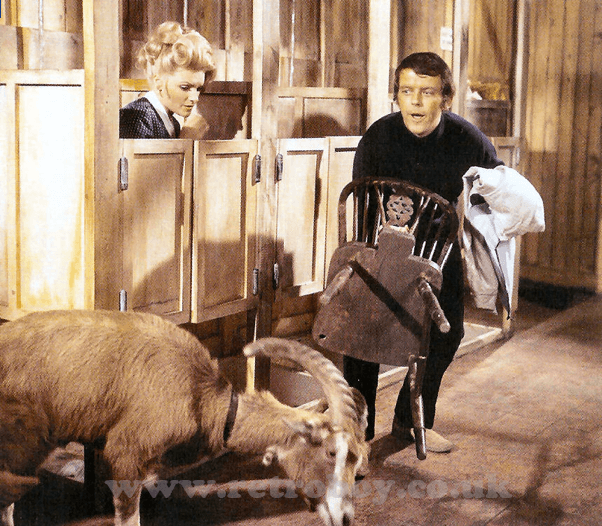 Above: The role of 'Jim Tanner' in 'Carry On Camping' was originally a much larger part. Part of the role centred around a romance with fellow co-star Trisha Noble who played 'Sally', one of the 'Chayste Place' girls. The scenes above, including the one with the goat trapping 'Sally' in the shower cubicle, were cut from the final film and ended up on the cutting room floor.